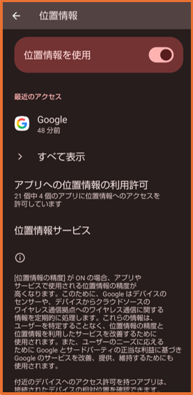 ・タップ:「位置情報を使用」のON/OFFの切り替え