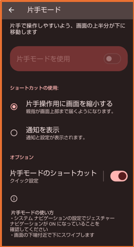 ・タップ:「片手モードを使用」のON/OFFの切り替え