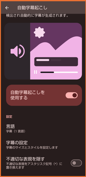 ・タップ:「自動字幕起こしを使用する」のON/OFFの切り替え