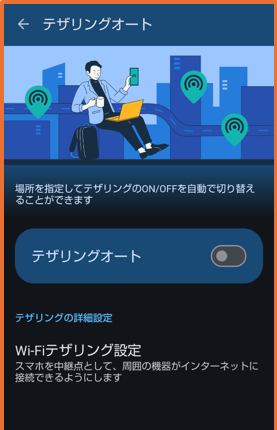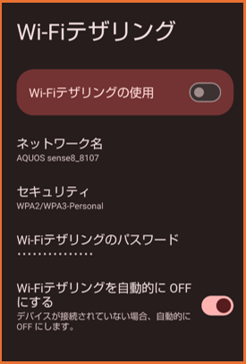 ・タップ:「Wi-Fiテザリングの使用」のON/OFFの切り替え