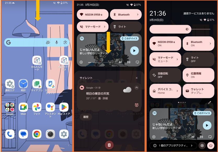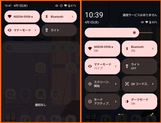 画面外(ステータスバー上)を下方向にスワイプすると、フルのクイック設定パネルが開きます。