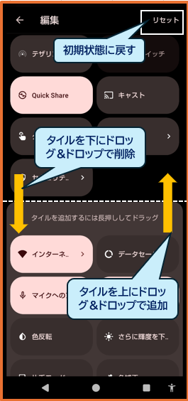 4.「クイック設定」でのタイル整理(追加/削除/並べ替え)の仕方