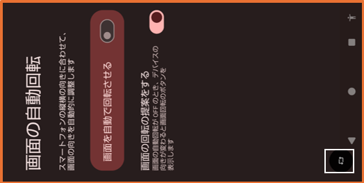 ※「画面の回転に提案をする」を有効にすると、「画面を自動で回転させる」が無効でも、デバイスを横向きにしたときに「回転」ボタンが表示されるので、タップすると横画面になります。